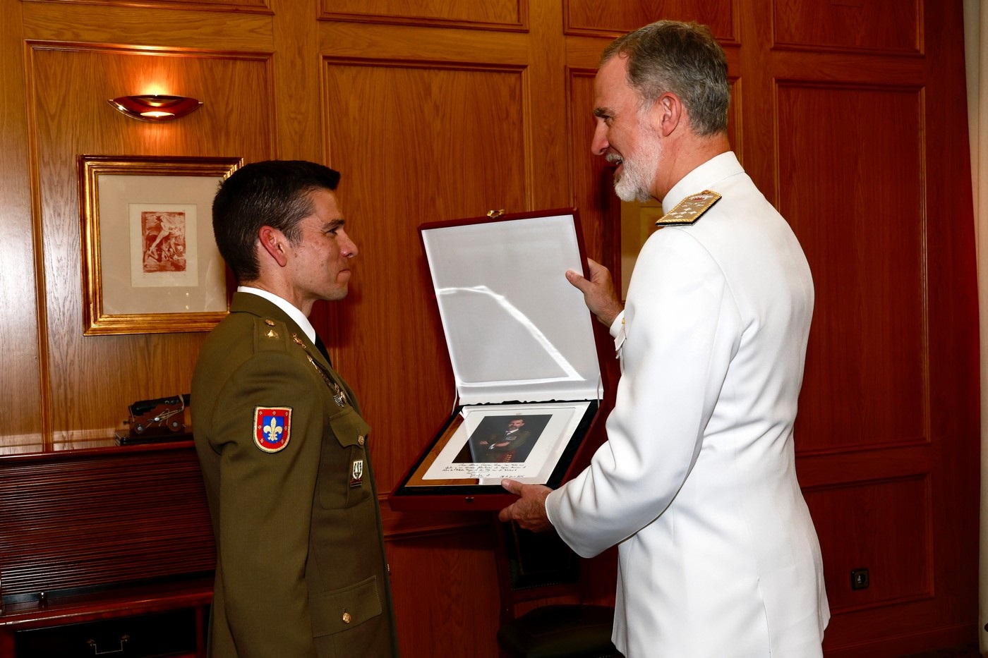 Tras el recibimiento, Don Felipe mantuvo un encuentro con las autoridades en la Sala de Autoridades y con los participantes y acompañantes del curso y recibió en audiencia al número uno de la promoción, el comandante de Infantería Álvaro Guzmán Peces.