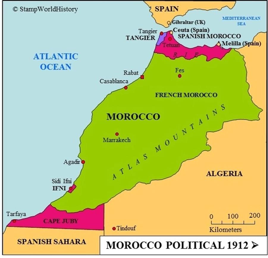 Figura 1. Detalle del territorio marroquí bajo el régimen de protectorado español y francés en el año 1912. Fuente: Stamp World History.