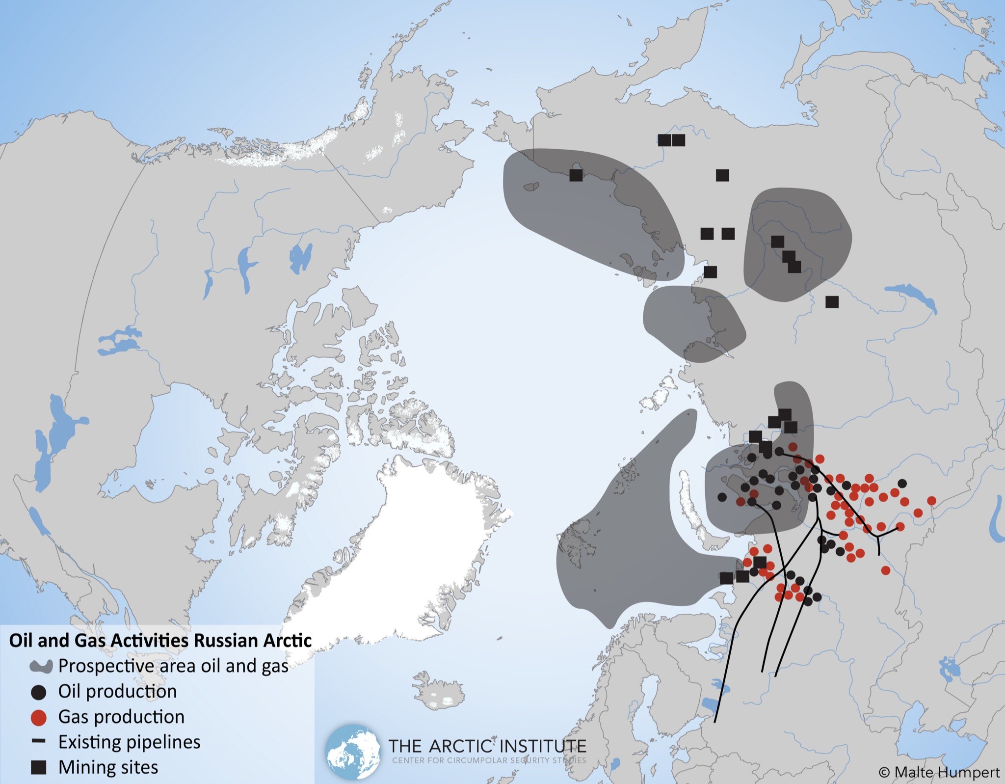 Actividades petroleras y gasísticas en el Ártico ruso. Fuente: Malte Humpert y The Arctic Institute (2016)