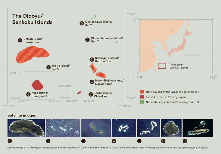 El archipiélago de las Senkaku/Diaoyu está formado por cinco islas y tres islotes, actualmente deshabitadas, en el Mar de China Oriental. Se encuentran a 140 kilómetros al suroeste de Pengjia, en Taiwán, y a 170 kilómetros al norte de la isla Ishigaki, Japón. Sus nombres y características son: