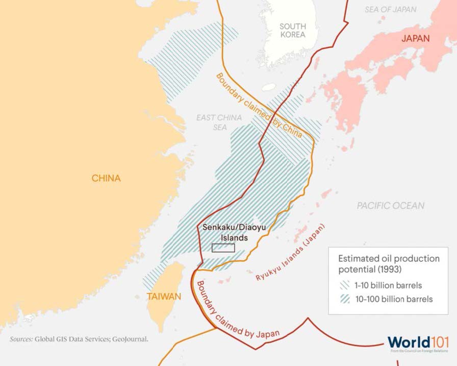 En 1995, China descubrió el yacimiento de gas natural de Chunxiao, cerca de la línea media que Japón propone como límite de las ZEE de ambos países. Además, el Mar de China Oriental está considerado como una zona con potencial en hidrocarburos. Estudios realizados por la Administración de Información Energética de los Estados Unidos (EIA) señala que el subsuelo marino del Mar de China Oriental puede contener grandes cantidades de recursos energéticos, sobre todo gas natural. Se estima que el área pueda haber más de veinte mil millones de metros cúbicos de gas natural47.