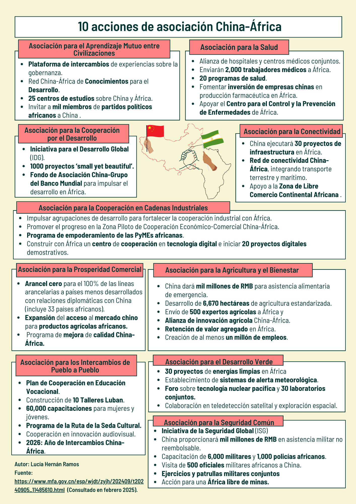 El principal resultado del FOCAC 2024 fue la aprobación de dos documentos; la Declaración de Pekín y el Plan de Acción de Pekín (2025-2027), fundamentado en principios de seguridad nacional de China como la Iniciativa de Seguridad Global (ISG)11. Tanto la Declaración como el Plan de Acción fueron aprobados por unanimidad12. El Plan de Acción de Pekín (2025-2027) establece la agenda a seguir durante los próximos 3 años en la cooperación entre China y África. Este plan está basado en 10 iniciativas de asociación y busca afianzar una asociación estratégica para el desarrollo sostenible, la modernización, la seguridad común y la construcción de una comunidad China-África de alto nivel con un futuro compartido.