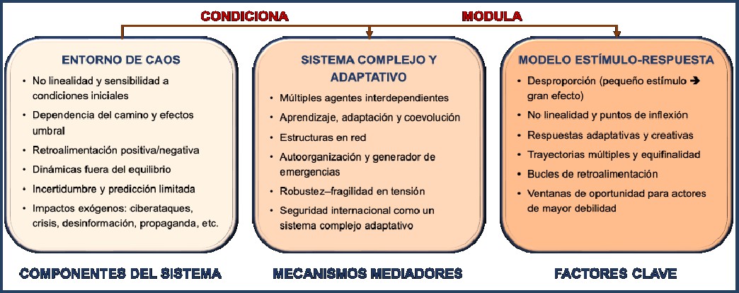 En las guerras actuales, especialmente en los conflictos asimétricos, este entorno caótico se manifiesta en la multiplicidad de actores (estatales y no estatales), la superposición de dimensiones (militar, económica, informacional, cibernética) y la volatilidad de las alianzas. Así, el modelo “estímulo-respuesta”, en el que se sustenta el equilibrio en un entorno de caos, se distorsiona, por cuanto la respuesta del sistema no es proporcional ni lineal, sino que puede amplificarse o mutar en direcciones inesperadas debido a la retroalimentación positiva y a la interacción con otras variables del entorno. La Figura 2 muestra esquemáticamente los componentes, mecanismos y factores que influyen en un sistema de caos y como los primeros lo condicionan, mientras que los mediadores permiten su modulación.