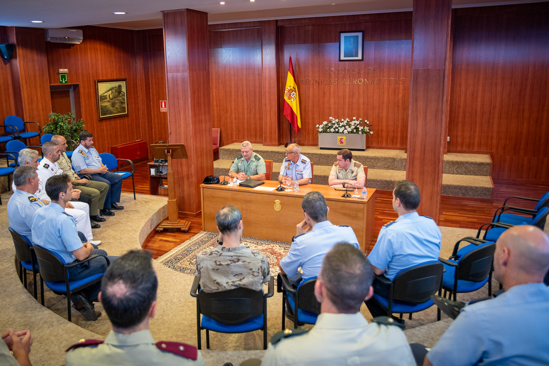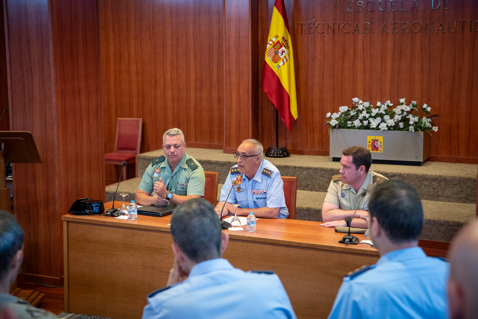 El acto estuvo presidido por el Coronel Director de la ESTAER, el Ilmo. Sr. D. Enrique García Castro, acompañado por el Comandante D. Pedro Hervás Delgado de Mendoza del Mando de Operaciones y por el Comandante GC D. Humberto Orlando Peña Gete de la Sección de Enseñanza de Perfeccionamiento Conjunta de la ESFAS.