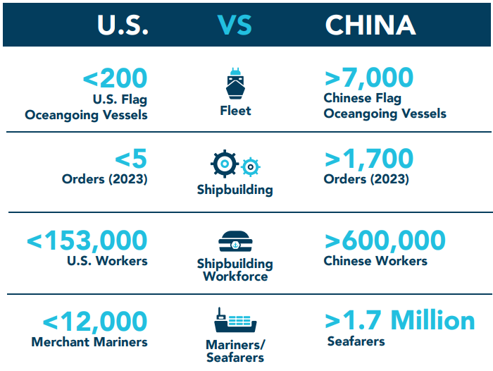 Figura 1: Comparativa de la situación actual de las industrias navales de Estados Unidos y de China (Fuente: Waltz, Kelly, Rubio & Garamendi, 2024).7