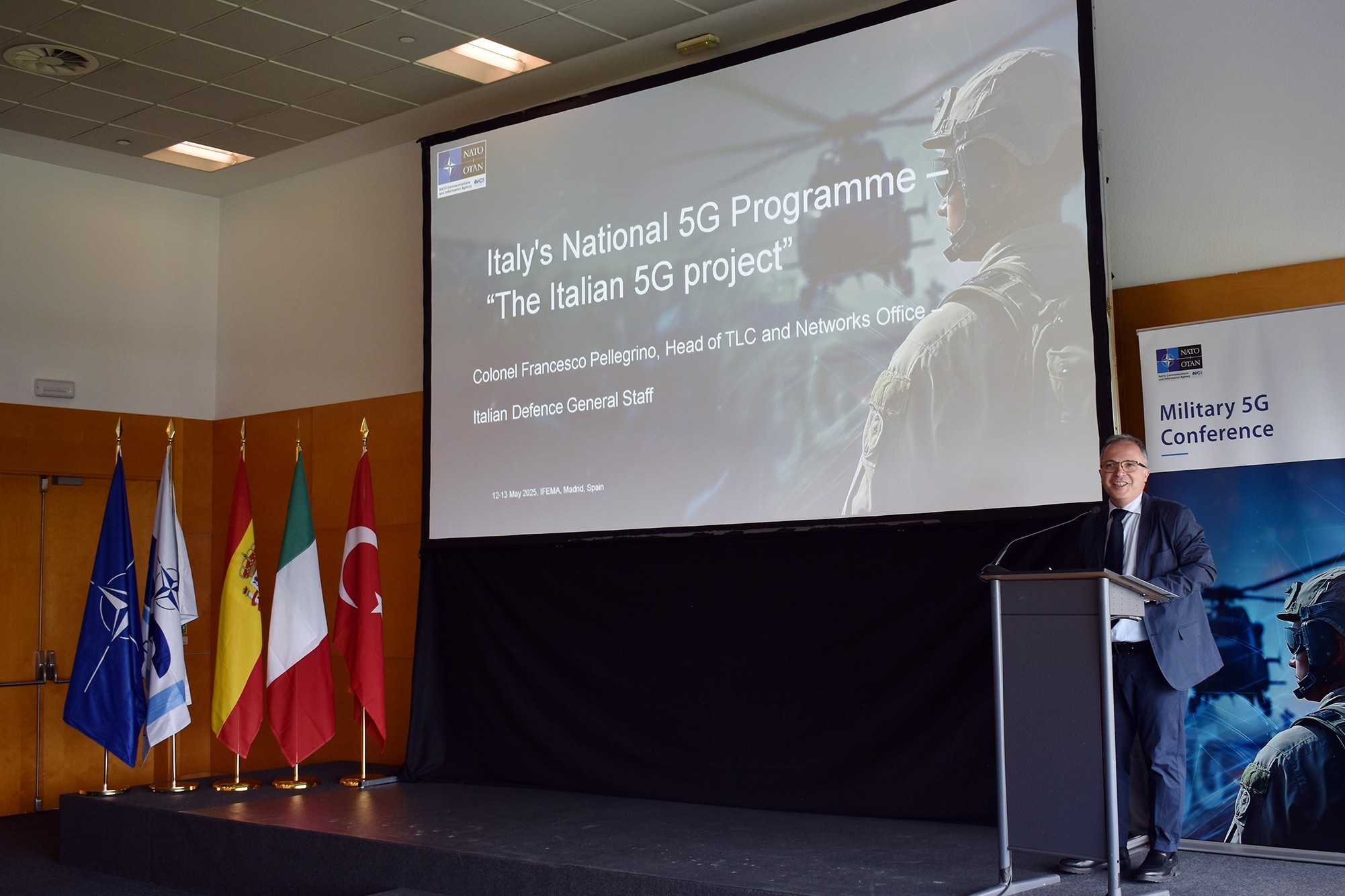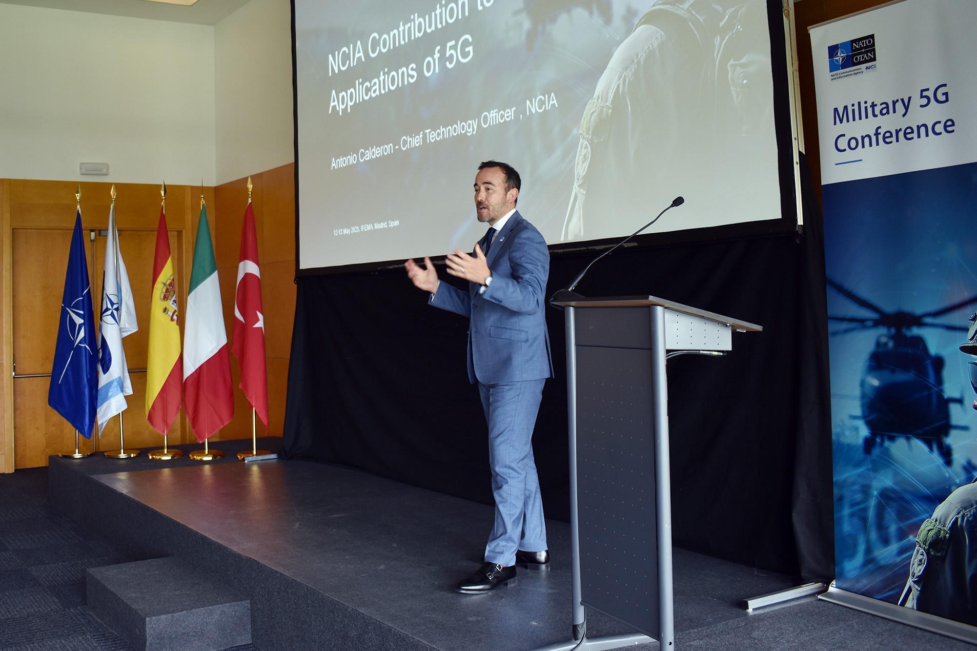 Por su parte, el jefe de tecnologías (CTO) de la Agencia de Información y Comunicaciones de la OTAN (NCIA), Antonio Calderón, ha presentado la contribución de la agencia a las aplicaciones militares 5G aliadas. Seguidamente, los países signatarios de la iniciativa MN5G –España, Italia y Turquía– ha presentado sus respectivos programas de desarrollo y usos de aplicación de la tecnología 5G en el ámbito militar.