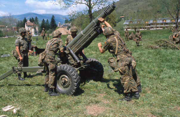 Soldados de la Brigada de Cazadores de Montaña (BRCZM) Aragón I colocan en posición una pieza de artillería de 105 mm durante un ejercicio en la localidad gerundense de Camprodón. (Edu Fernández/RED)
