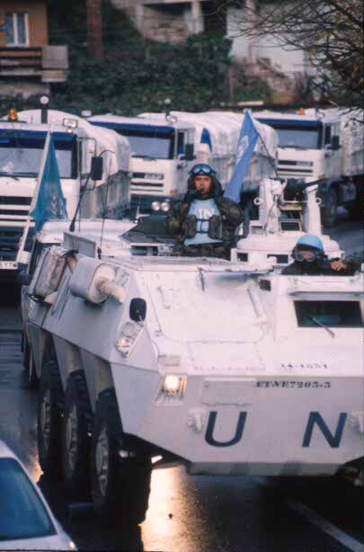 Un convoy de ayuda humanitaria escoltado por blindados medios sobre ruedas (BMR) de la Agrupación Málaga, integrada por personal de la Legión, en Bosnia-Herzegovina en noviembre de 1992. (Jorge Mata/RED)