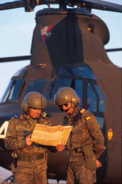 Los tripulantes de un helicóptero de transporte Chinook de las Fuerzas Aeromóviles del Ejército de Tierra (FAMET) estudian sobre el mapa, antes de despegar, la misión de vuelo. (Pepe Díaz/RED)