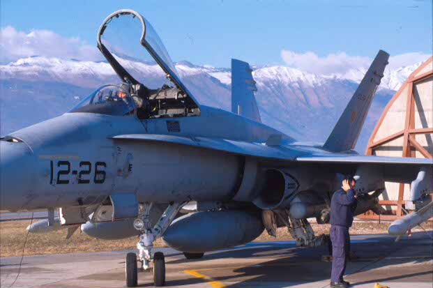 Un F-18 del destacamento Ícaro, participante en el despliegue aéreo de la OTAN en la base italiana de Aviano para la vigilancia de los cielos de la antigua Yugoslavia, se prepara para despegar. (Edu Fernández/RED)