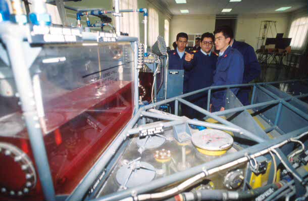 Los futuros suboficiales del Ejército del Aire estudian un circuito de combustible de un avión en la academia de Virgen del Camino, en León. (Edu Fernández/RED)