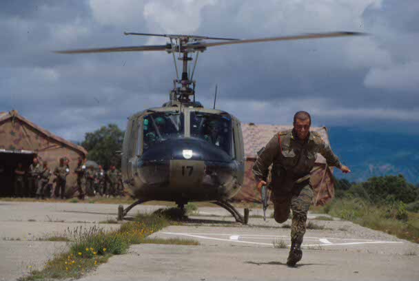 Un cadete de la Academia de Suboficiales del Ejército de Tierra de la localidad ilerdense de Talarn realiza un ejercicio de desembarco desde un helicóptero de las Fuerzas Aeromóviles del Ejército de Tierra (FAMET). (Pepe Díaz/RED)