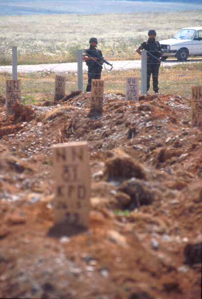 Legionarios del batallón español integrado en la Fuerza Internacional de Seguridad para Kosovo (KFOR), custodian una fosa común en las afueras de la localidad de Rakoç. (Edu Fernández/RED)