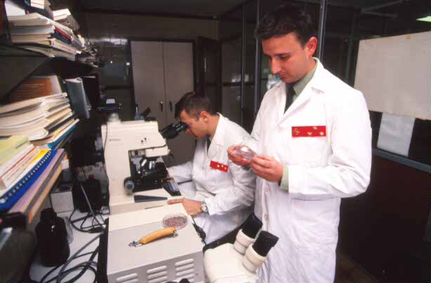 Veterinarios del Cuerpo Militar de Sanidad inspeccionan unas muestras de alimentos en un laboratorio del Centro Militar de Veterinaria de Madrid. (Edu Fernández/RED)