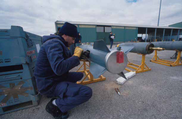 Un soldado profesional del Ejército del Aire revisa el armamento utilizado por aviones de combate en los ejercicios Tormenta '95. (Edu Fernández/RED)
