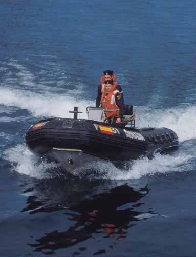 Marineros profesionales de la corbeta Descubierta transportan material en una lancha neumática en aguas de la base naval de Cartagena. (Edu Fernández/RED)