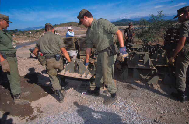 Soldados de la unidad de Ingenieros destacada en el pueblo nicaragüense de Somotillo reconstruyen, en diciembre de 1998, el puente que cruza el río Guasaule, en la frontera entre Honduras y Nicaragua, destruido por el huracán Mitch. (Edu Fernández/RED)