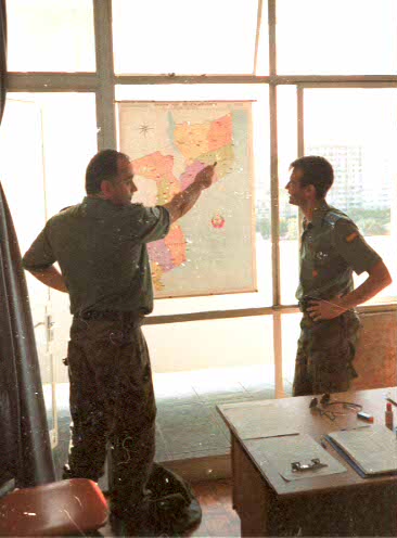 Dos oficiales españoles de la Misión de las Naciones Unidas para Mozambique (ONUMOZ) observan el despliegue del contingente sobre un mapa. (RED)
