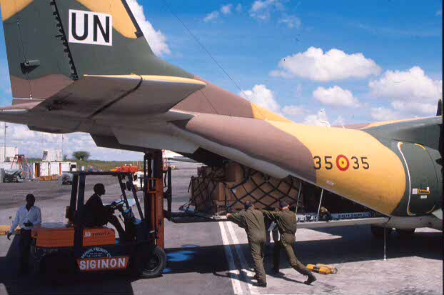 Un avión de transporte CN-235 del Ala 35 del Ejército del Aire español carga ayuda humanitaria para trasladarla a los campos de refugiados en Ruanda. (Pepe Díaz/RED)