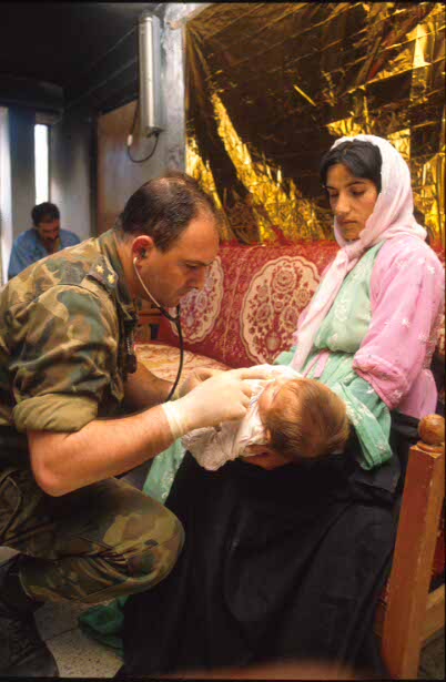 Un médico del Escalón Médico Avanzado del Ejército de Tierra (EMAT) atiende a un niño durante la misión de ayuda humanitaria al pueblo kurdo. (Pepe Díaz/RED)