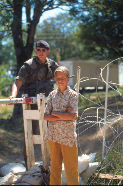 Un soldado de la Brigada Paracaidista perteneciente al contingente español destacado en la antigua Yugoslavia e integrado en la Fuerza de Implementación de la Paz (IFOR) de la OTAN vigila la entrada de un destacamento en la localidad serbo-bosnia de Nevesinje. (Edu Fernández/RED)