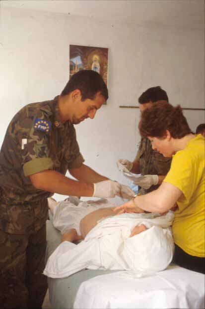 Un sanitario del Escalón Médico Avanzado del Ejército (EMAT) realiza una cura a una anciana en el dispensario de la Agrupación Serranía de Ronda en la localidad albanesa de Senghjin. (Pepe Díaz/RED)