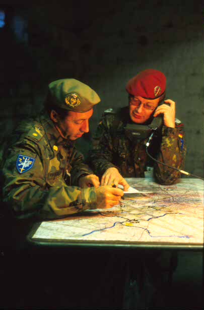 Un oficial español y otro alemán estudian el despliegue de fuerzas del Eurocuerpo durante el ejercicio Pegasus '96 celebrado en la localidad francesa de Laon. (Jorge Mata/RED)