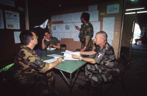 Un oficial español, junto a otros de Francia, Italia y Portugal, realizan el seguimiento del ejercicio Eolo '98 en el cuartel general de Eurofor. (Edu Fernández/RED)