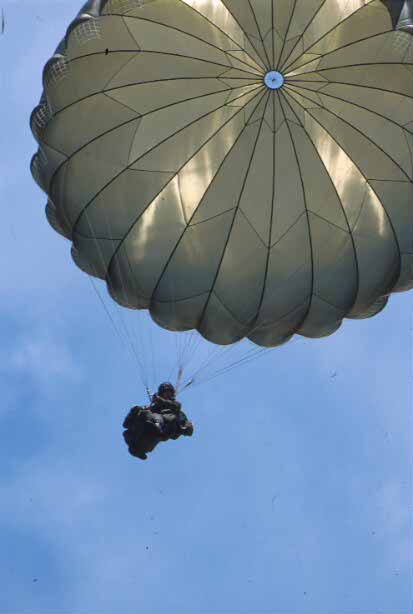 Un integrante de la Brigada Paracaidista (BRIPAC) española toma tierra en la base de Castres (Francia) durante el ejercicio Eolo'98. (Edu Fernández/RED)