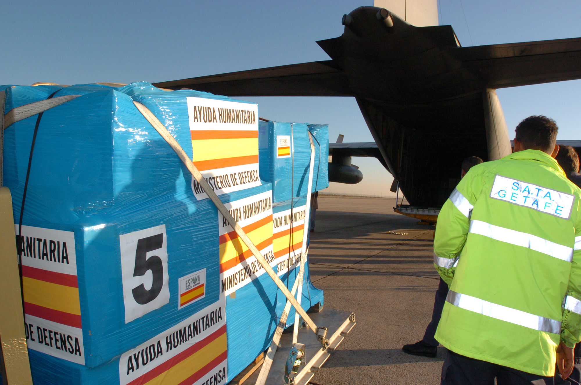 Avión "Hércules" de la Base Aérea de Getafe, donde se transportaban fundamentalmente materiales de ayuda humanitaria, entre los que se encuentran una planta potabilizadora de agua, medicinas, productos sanitarios y alimentos.