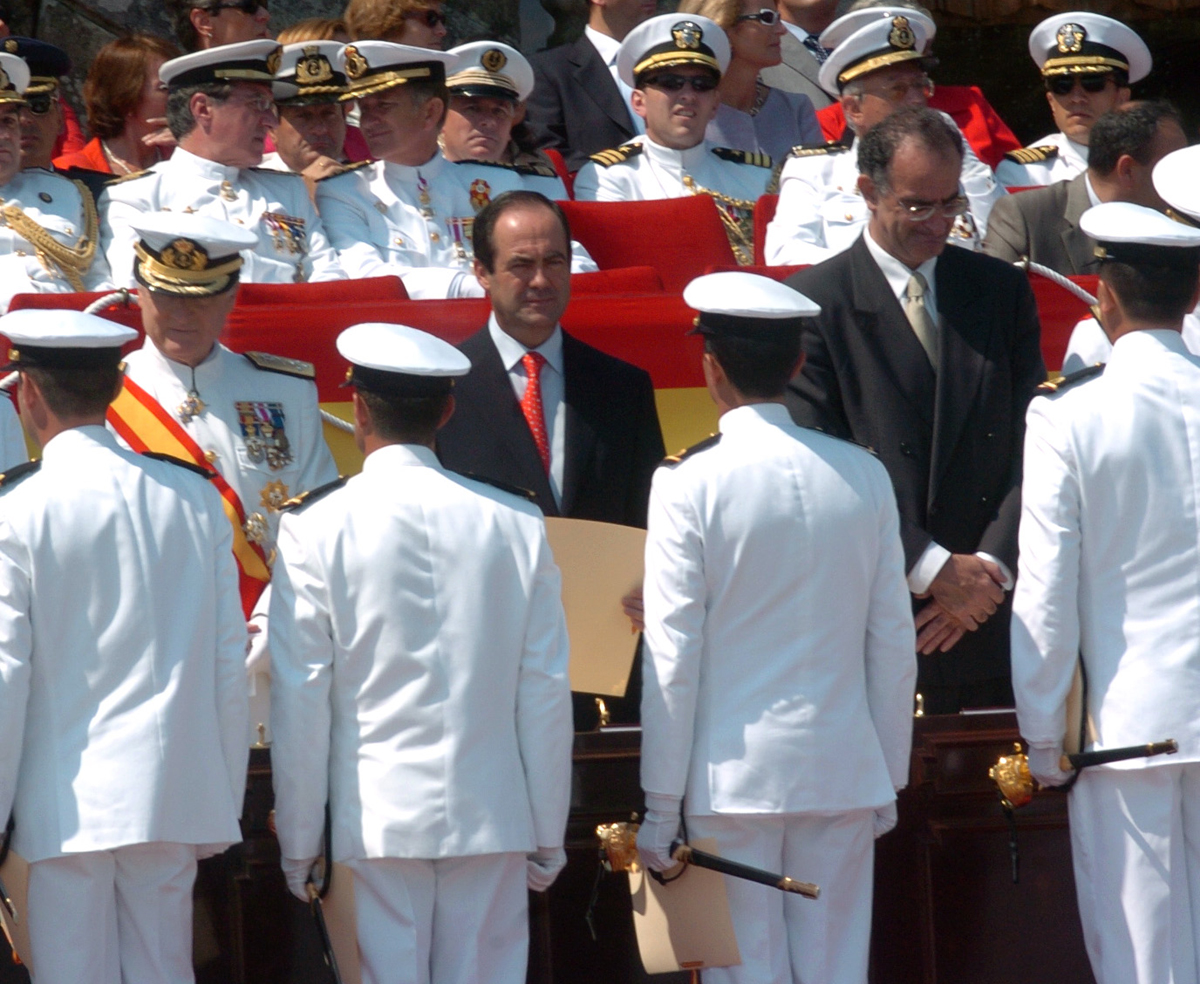 El Ministro de Defensa, D. José Bono durante la entrega de Reales Despachos a los 76 nuevos oficiales de la Armada en la Escuela Naval Militar de Marín (Pontevedra)