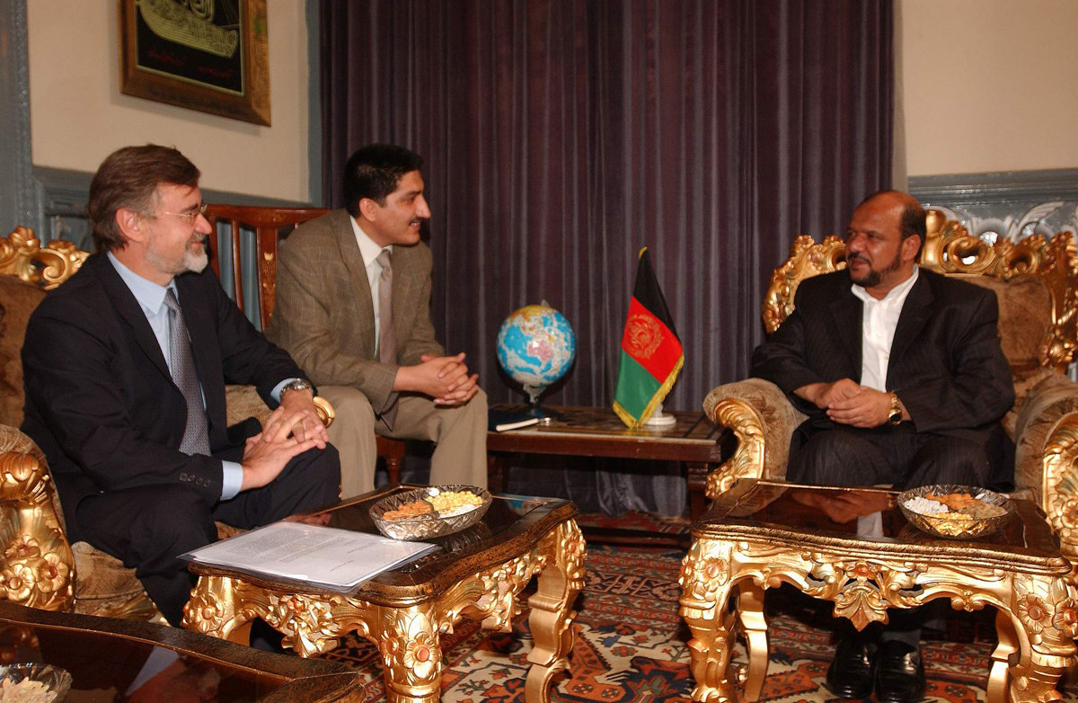 Con motivo de la entrega de ayuda humanitaria al hospital indira Ghandi de Kabul, el Sr. Leopoldo Stampa, durante la entrevista que mantuvo con el Ministro de Defensa del gobierno afgano Fahim Qham (derecha).