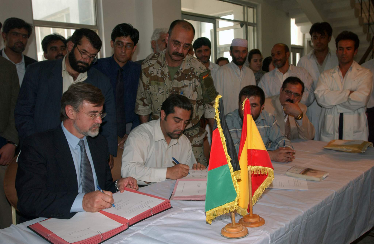 El Viceministro de Sanidad del gobierno afgano, Ferozudin Feroz, firma la recepción de la ayuda humanitaria en presencia del Sr. Stampa (a la izquierda) y del Director del Hospital Dr. Razeh (segundo a la derecha).