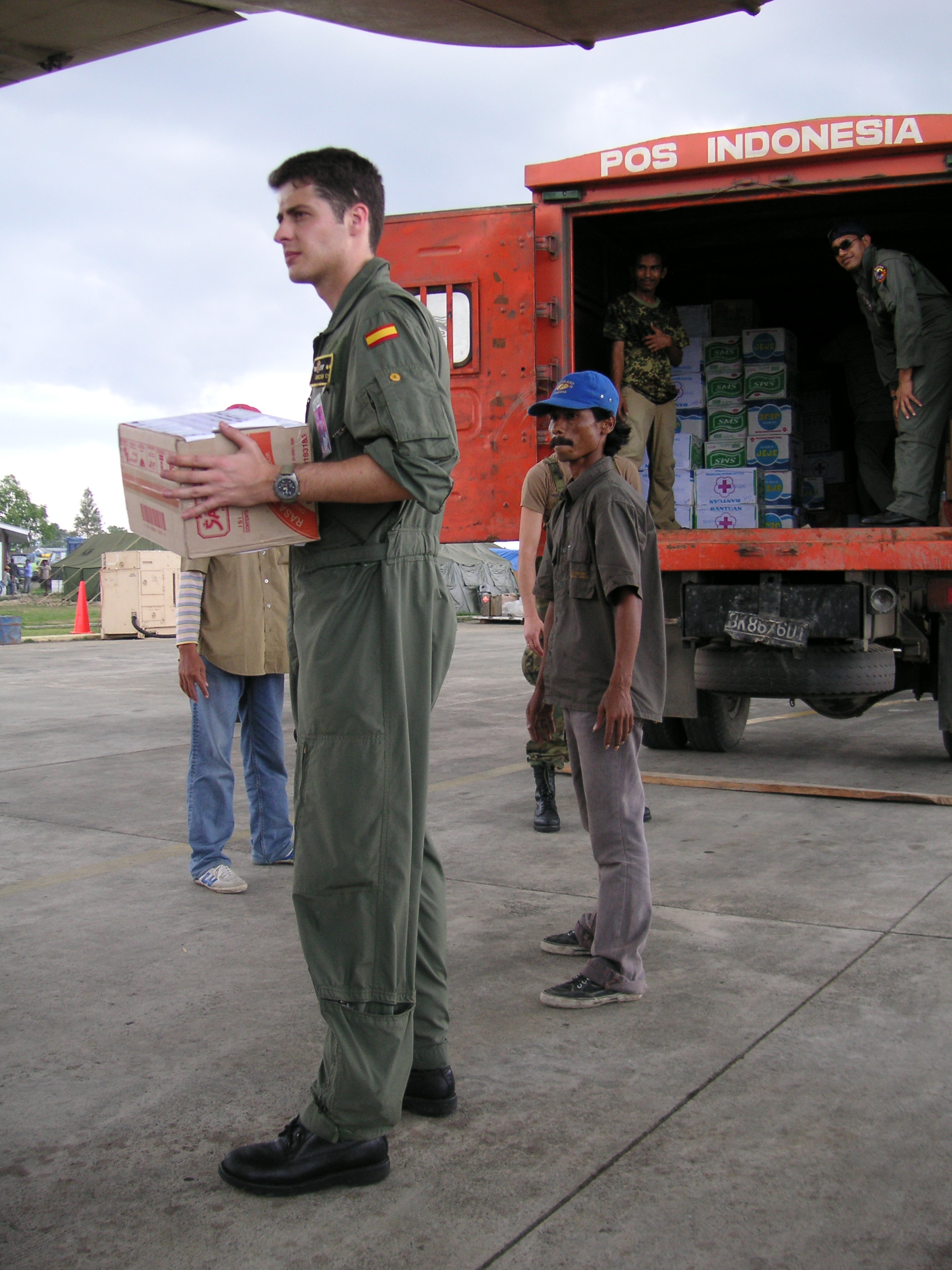 Miembro de la tripulación, haciendo entrega de la ayuda humanitaria a su llegada a Sumatra