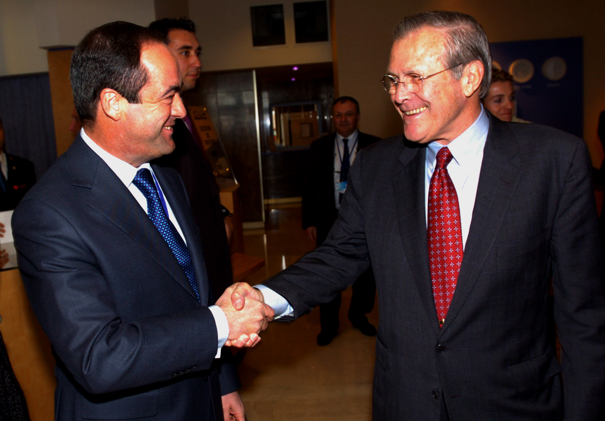 El ministro de Defensa, José Bono saluda a su homólogo norteamericano Donald Rumsfeld en Niza