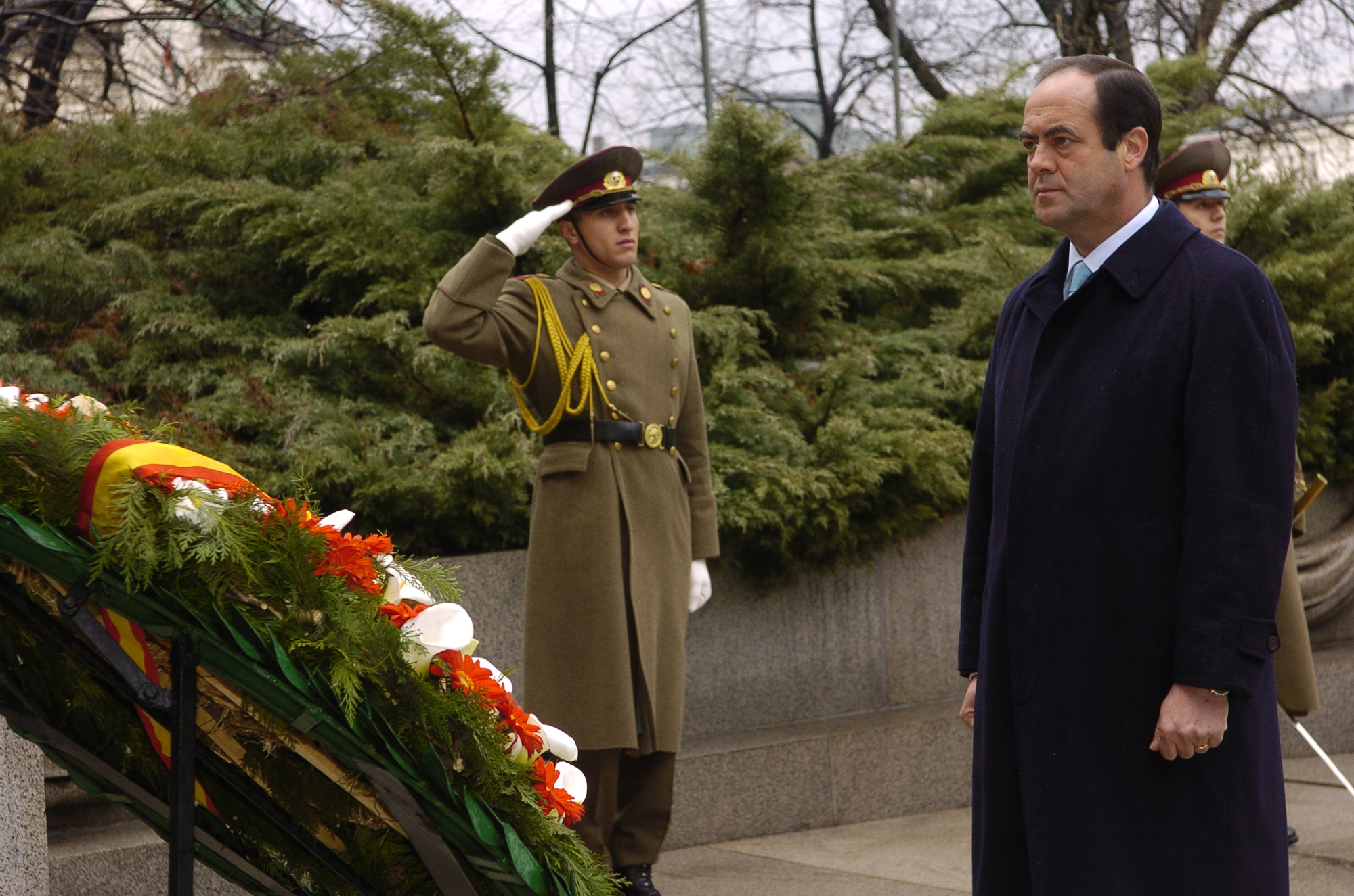 El ministro de Defensa, José Bono, deposita en Sofía una corona ante el monumento al soldado desconocido