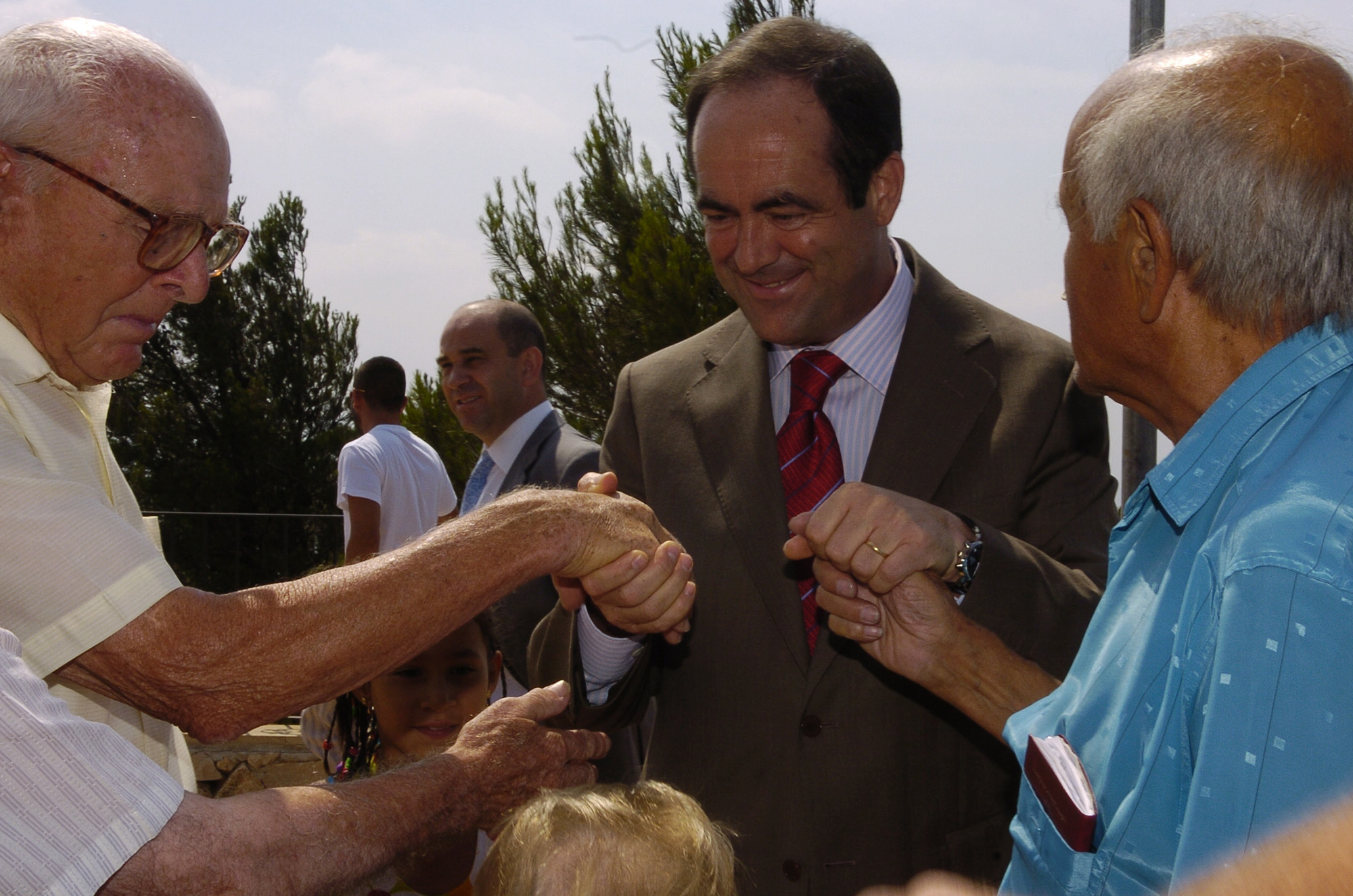 El ministro de Defensa, José Bono, une las manos las manos de dos componentes de la quinta del Biberon que sirvieron en bandos contrarios
