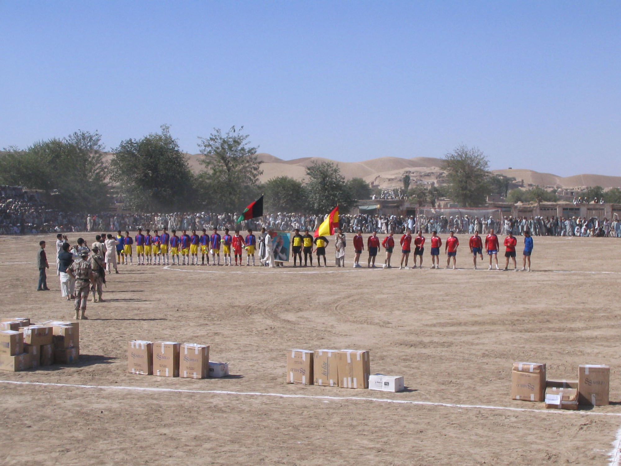 Equipos en el centro del campo antes de iniciarse el partido con la ayuda humanitaria