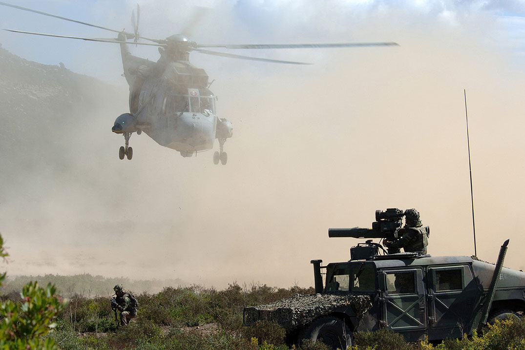 Hammer de la Infantería de Marina española junto a un helicóptero SEA KING, durante el ejercicio Loyal Midas.