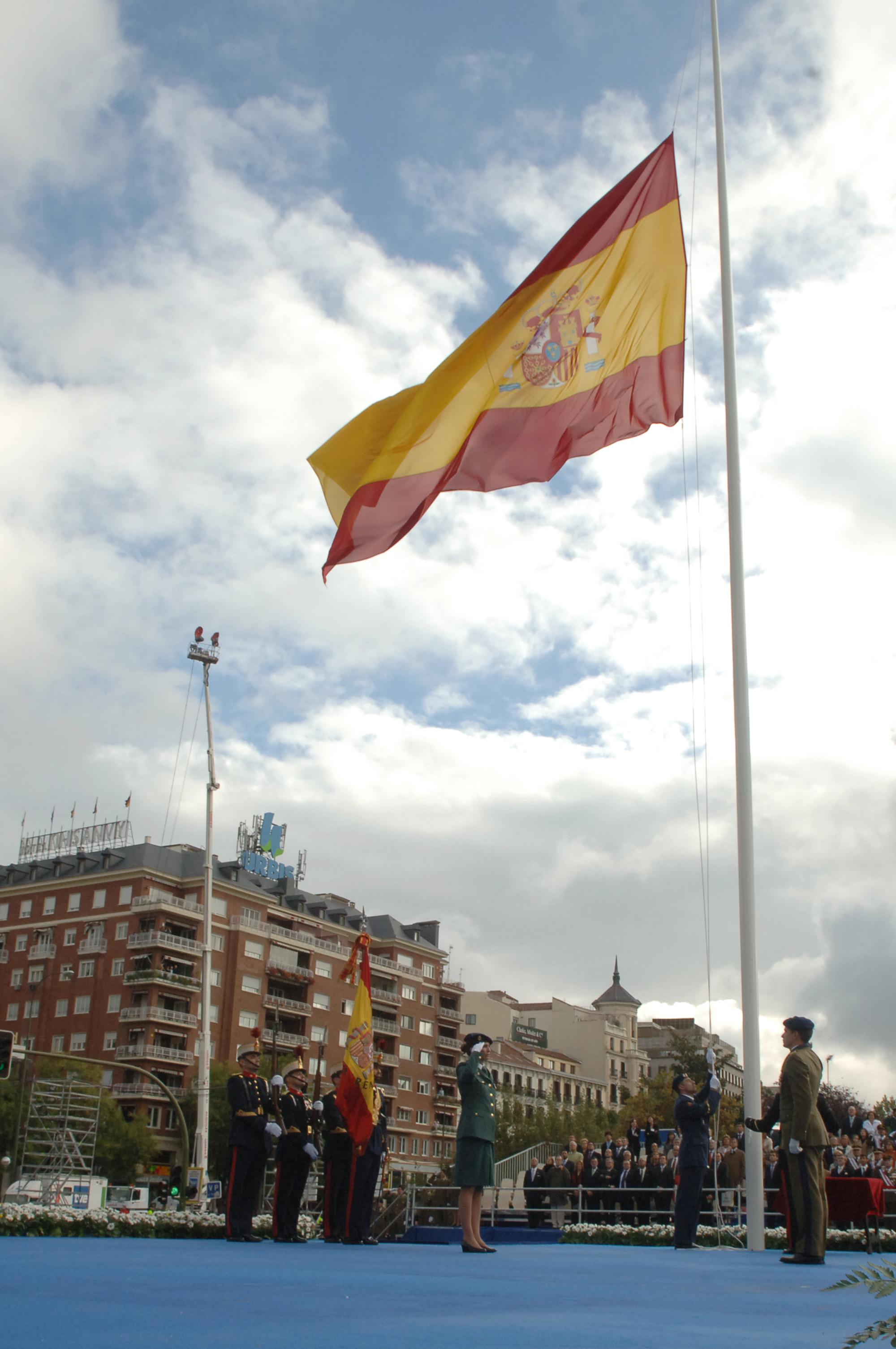 Soldados de los ejercitos de Tierra, Armada, Aire y de la Guardia Civil, izan la Bandera de España en el Paseo de la Castellana, presidiendo los actos y desfile desarrollados con motivo del día de la Hispanidad
