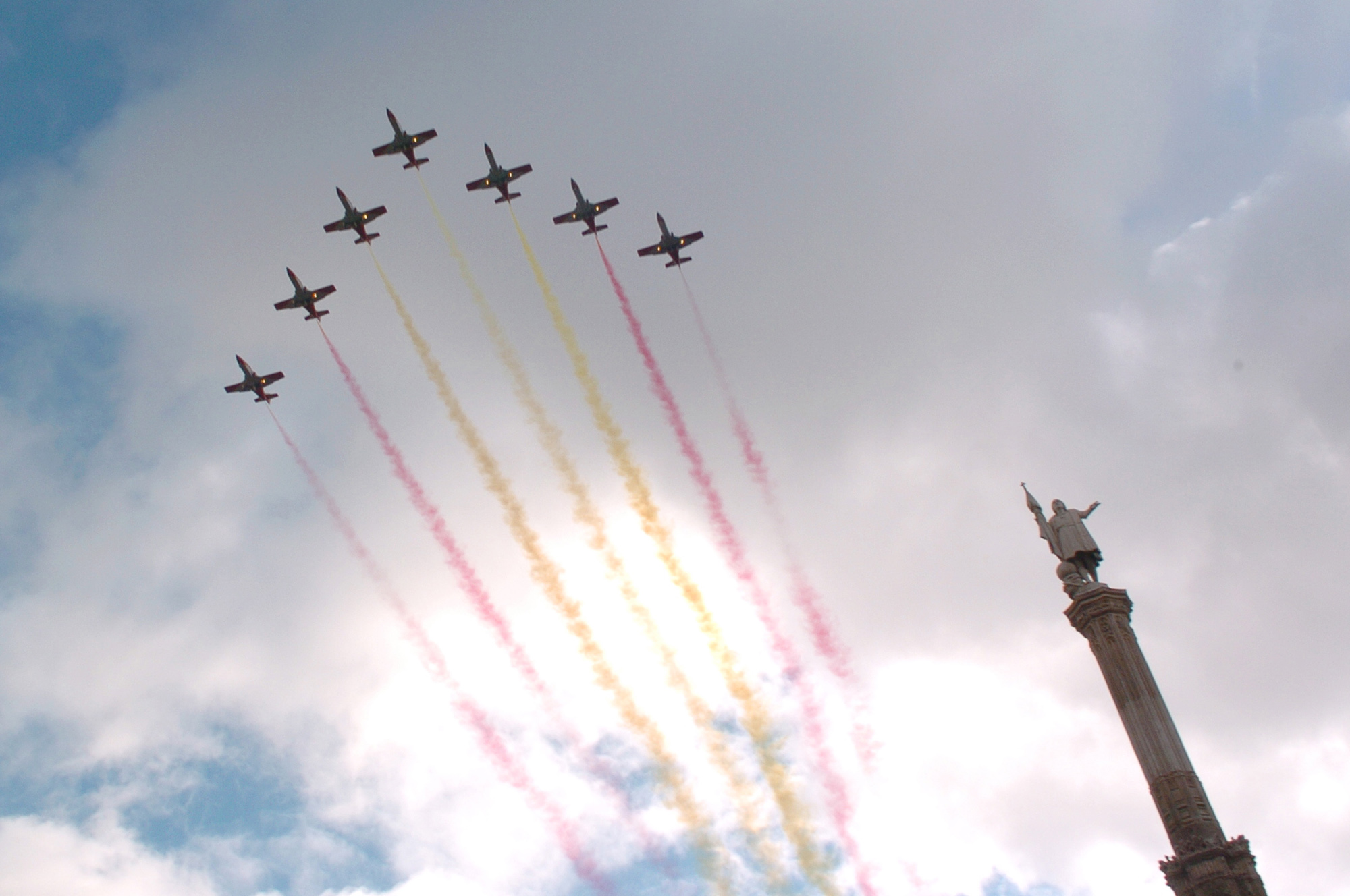 La Patrulla Aguila del Ejército del Aire realiza una pasada al durante el acto de homenaje a los caidos en la Plaza de Colón