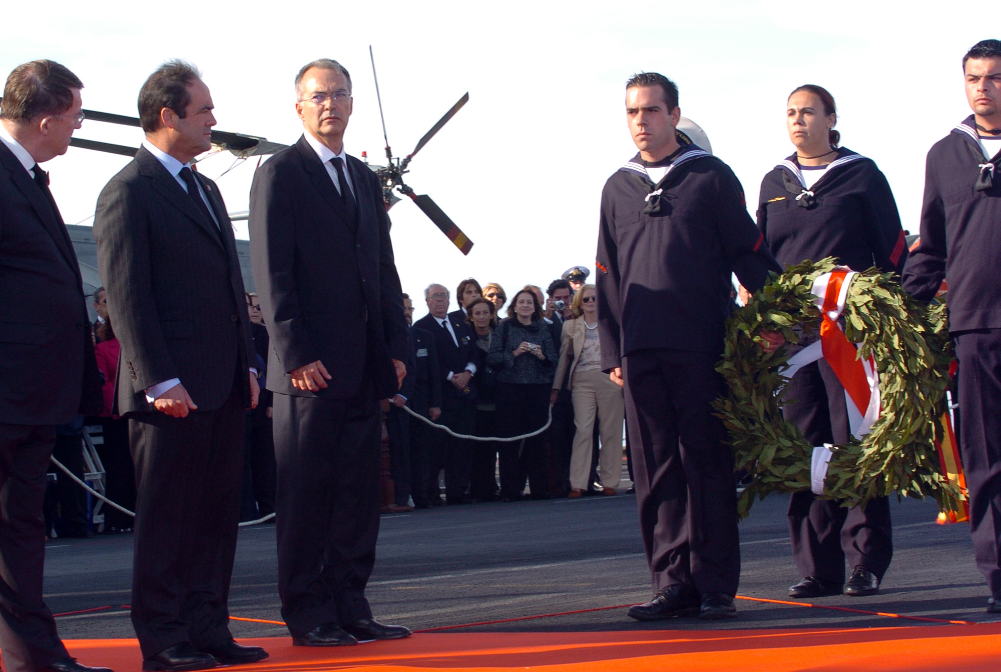 El ministro de Defensa, junto con los embajadores de Francia y de Inglaterra, se disponen a lanzar las coronas a la mar ,al paso de las fragatas ,"Reina Sofia","Montcalm", Y Chatham", española, francesa e inglesa, respectivamente.