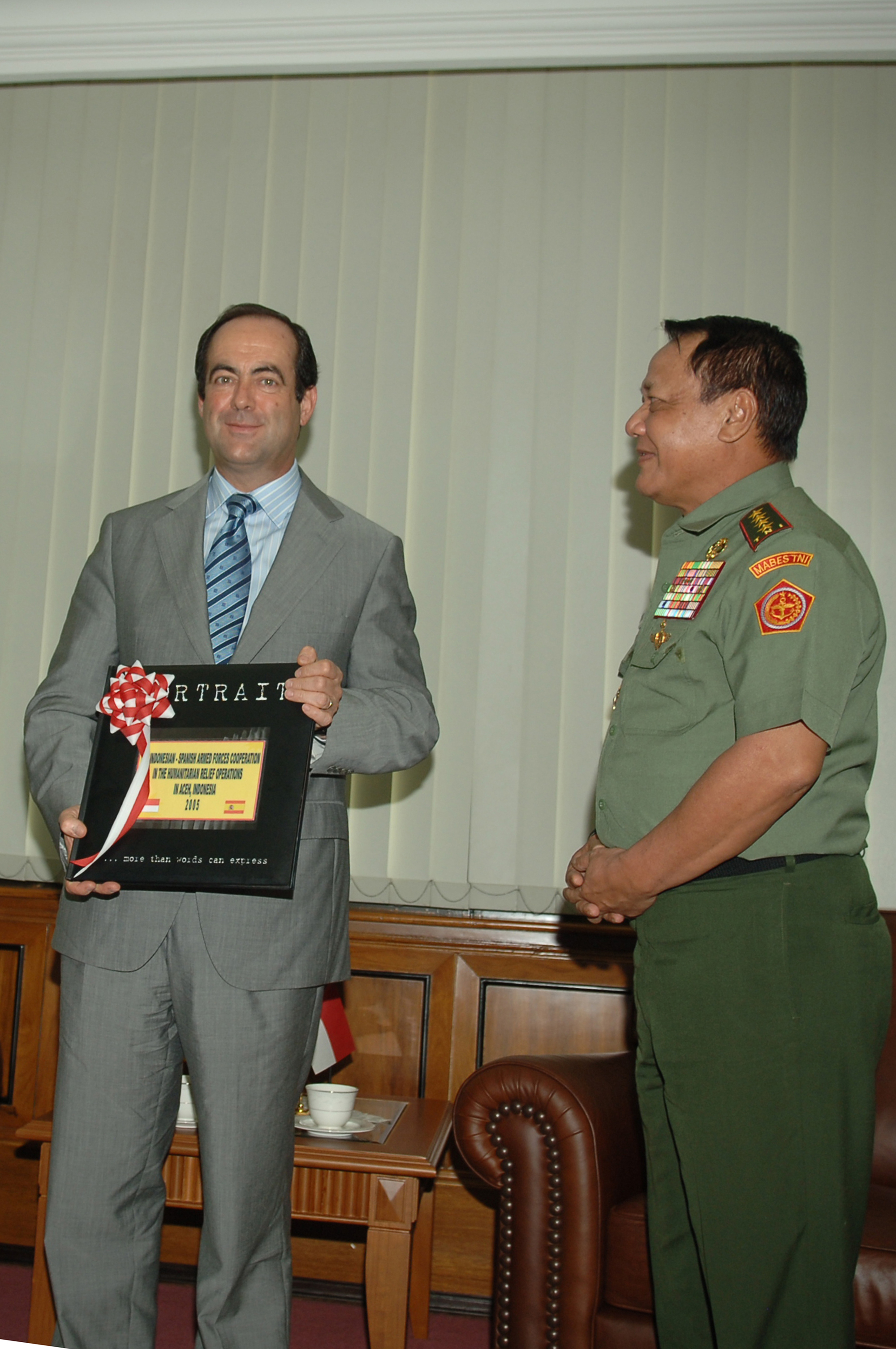 El ministro de Defensa, José Bono, muestra el album que el JEMAD de Indonesia, Endriartono Sutarto, le regala para el recuerdo de los soldados españales que prestaron su ayuda tras las inundaciones del Tsunami