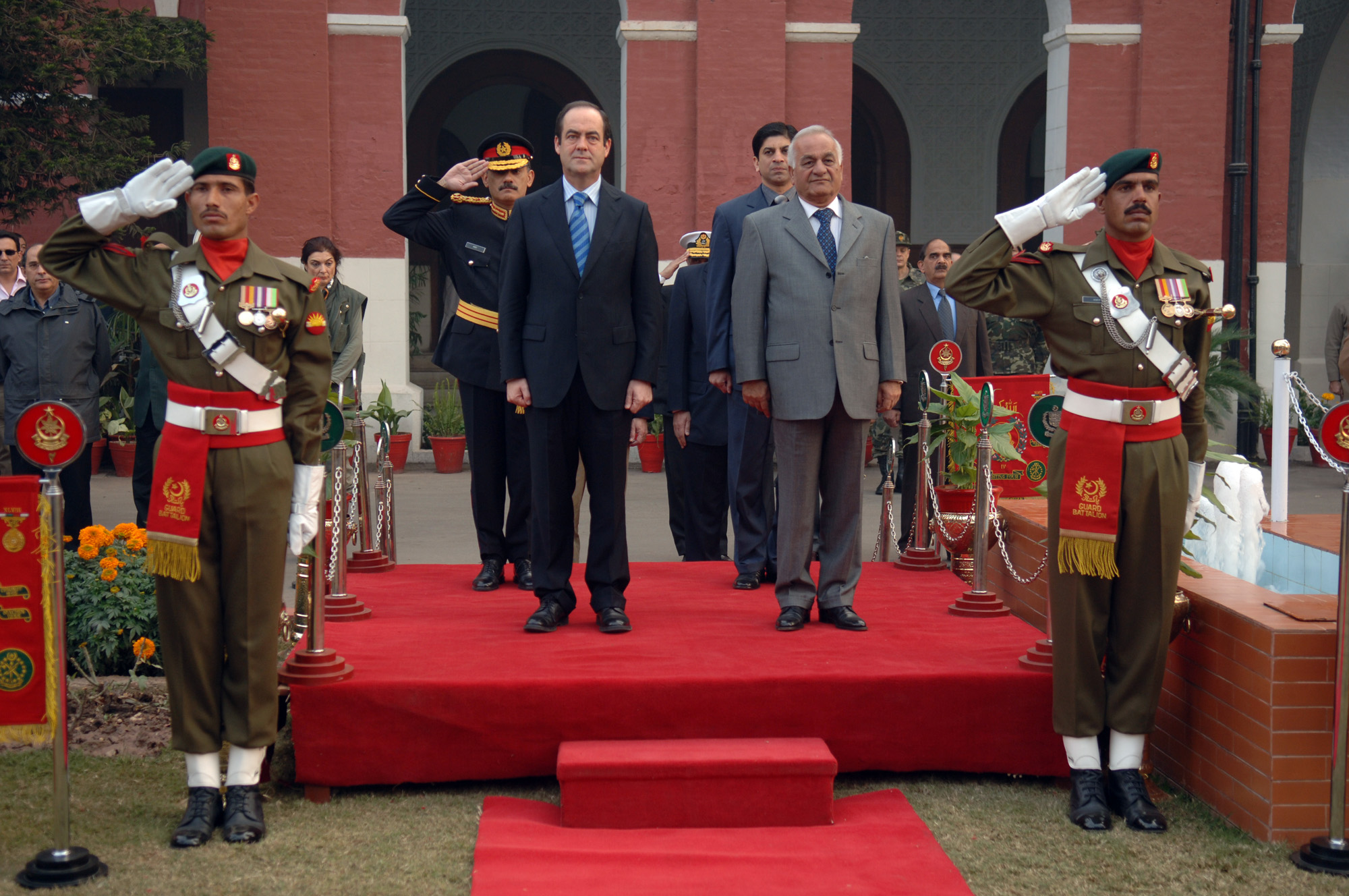 Los ministros de Defensa de Eapña y Pakistán, José Bono y Rao Sikandalr, reciben honores en la sede del Ministerio de Defensa en Islamabab