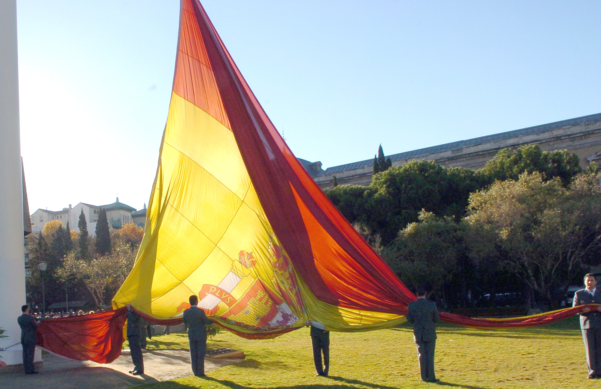 Momendo del izado de la Bandera Nacional en la plaza del Descubrimiento de Madrid