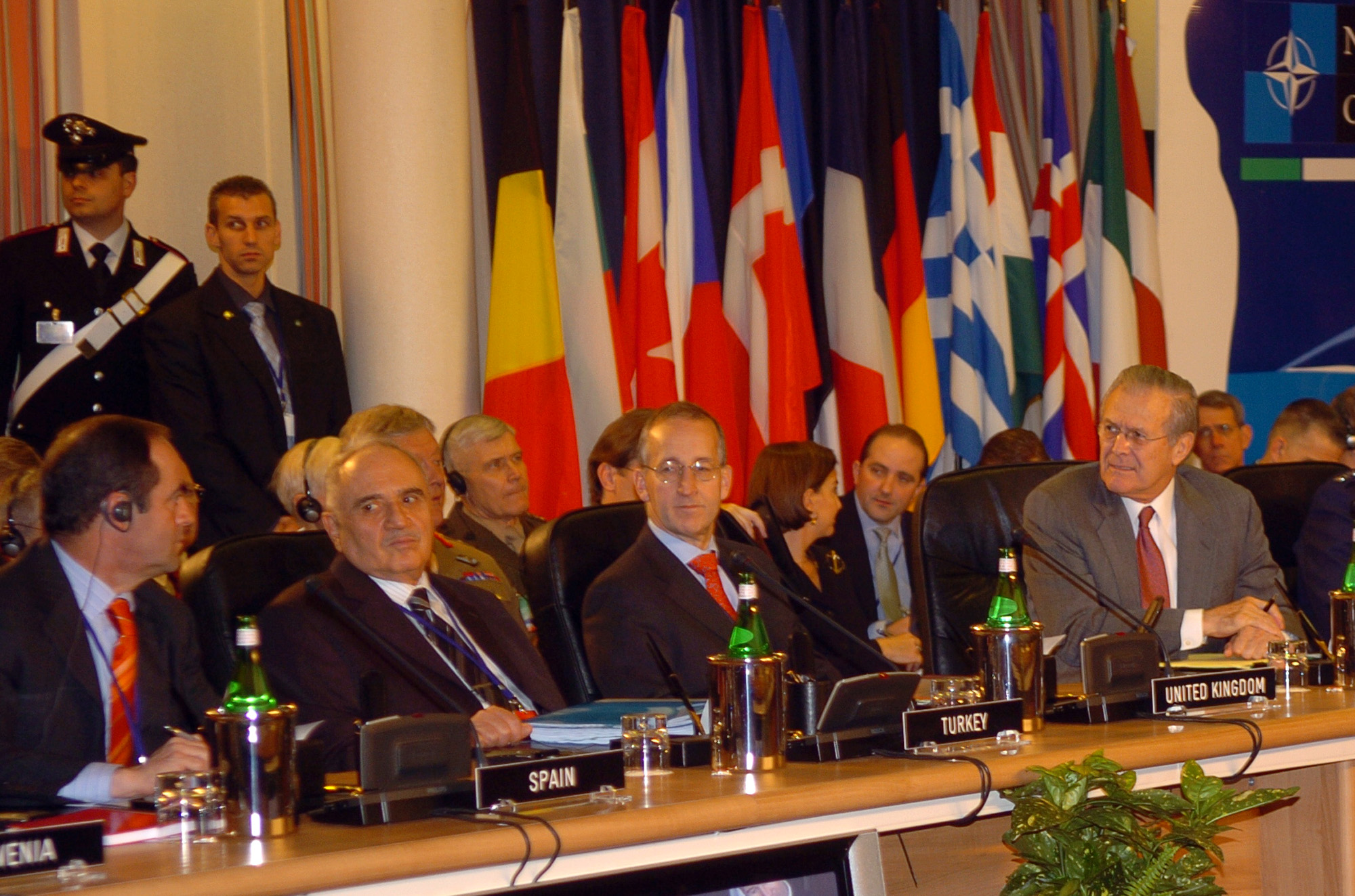 Los ministros de Defensa de España y de EEUU, conversan ante la atenta mirada de los ministros de Turquía e Inglaterra