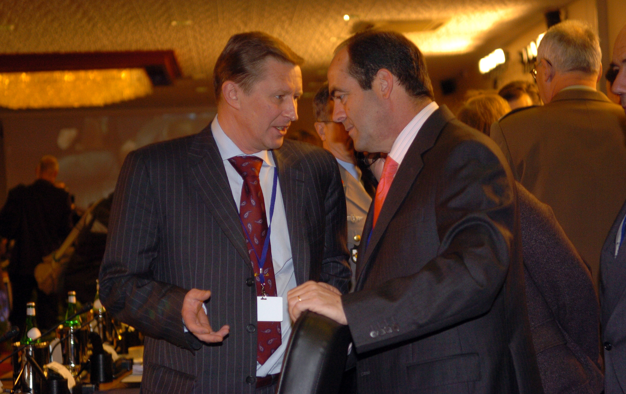 El ministro de Defensa, José Bono, conversa con el ministro de Defensa ruso, Sergey Ivanov, momentos antes de empezar la reunión informal del consejo OTAN-Rusia (NRC)