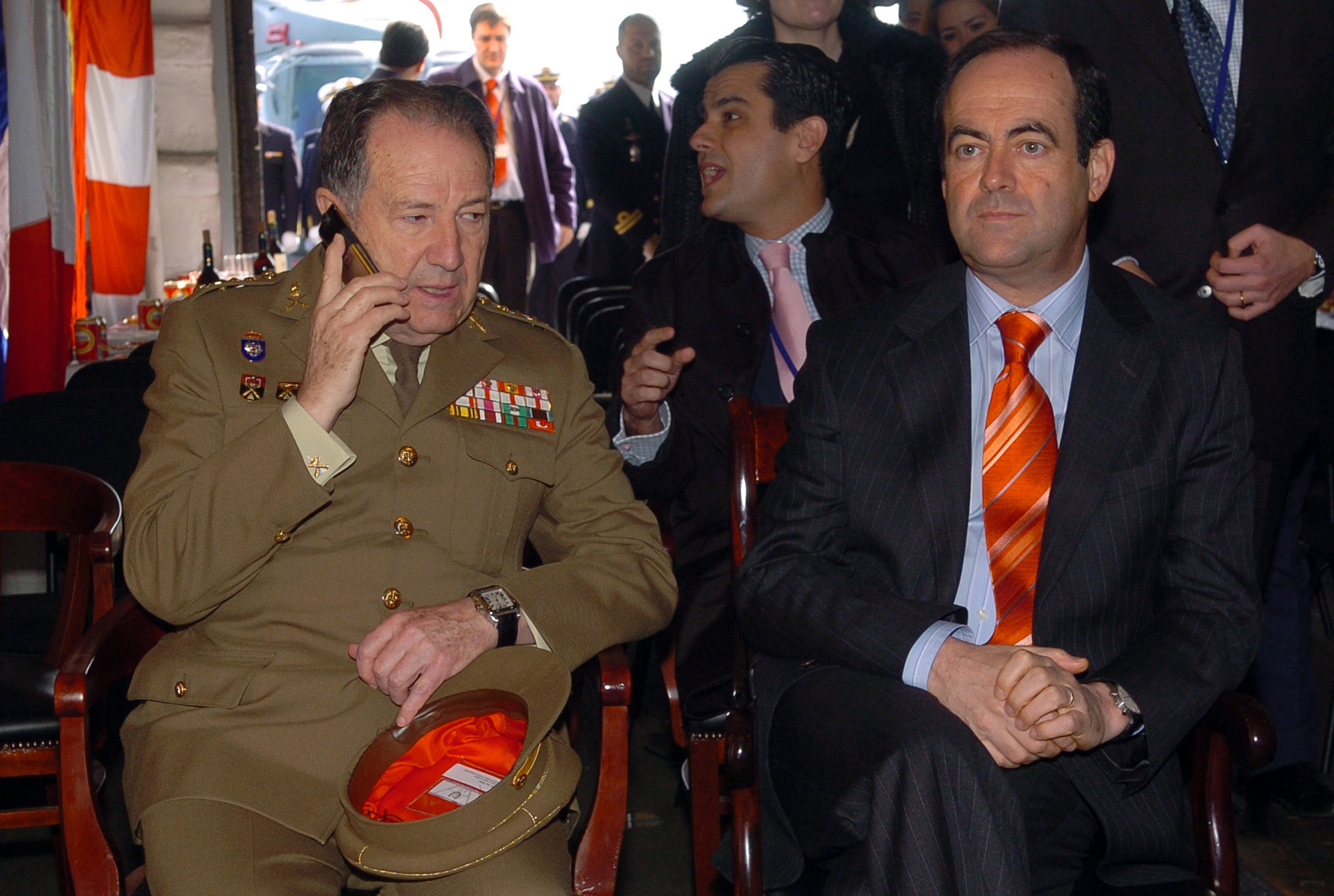 El ministro de Defensa, José Bono, acompañado del JEMAD, General de Ejército, Felix Sanz, reciben información sobre la misión de la fragata 'Navarra'