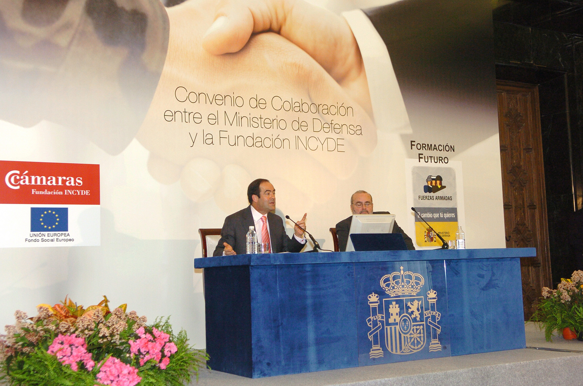 El ministro de Defensa, José Bono, se dirige a los asistentes tras la firma del convenio colaboración entre el Ministerio de Defensa y la Fundación INCYDE.