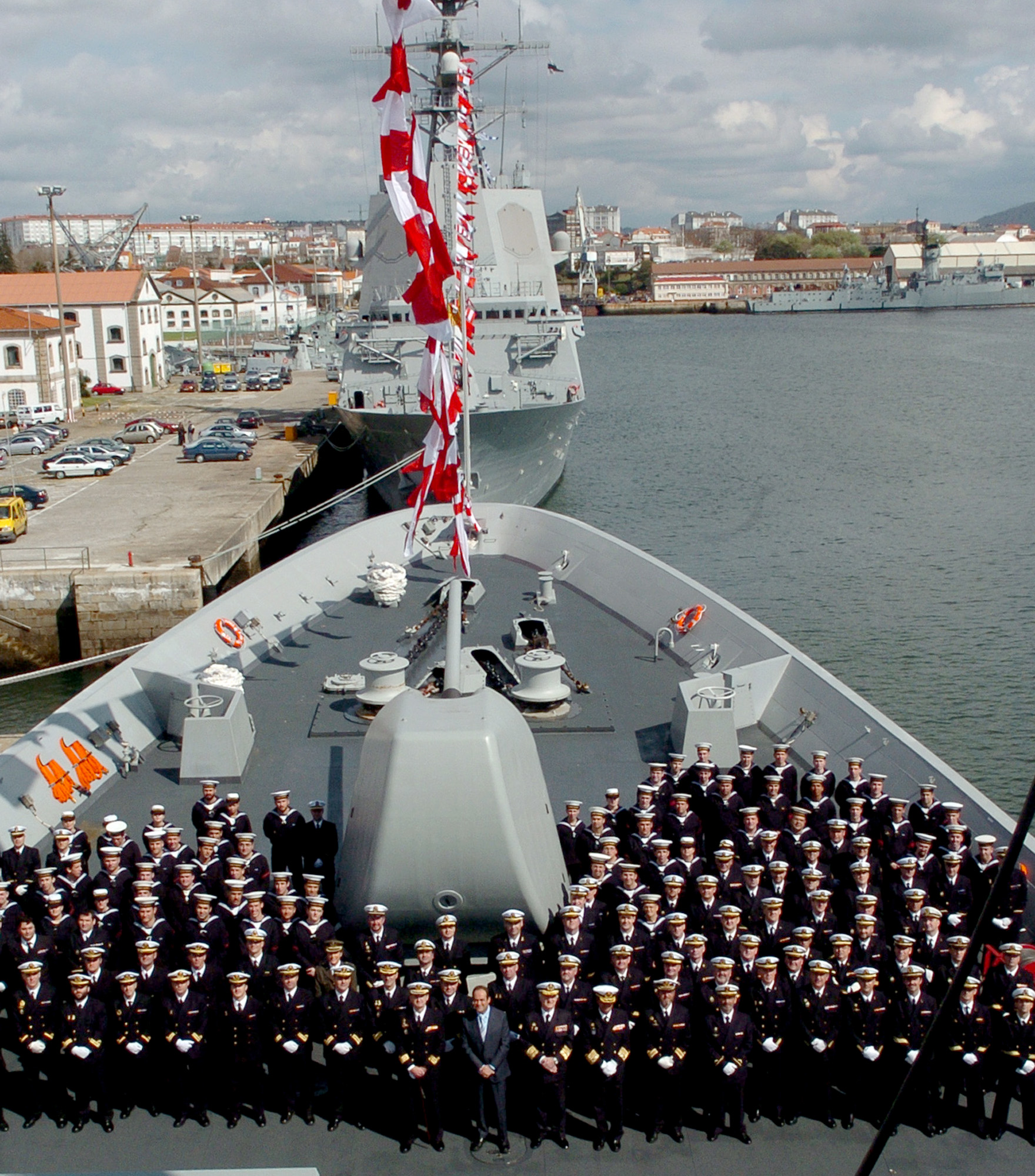 El ministro de Defensa, José Bono, se con la dotación de la fragata, F-104 Méndez Núñez